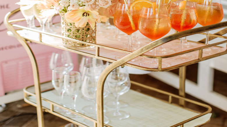 A bar cabinet, bar cart, side table, counter island, and similar kitchen or dining room spaces can all be used as a temporary drink station where you can gather bar tools, wine, drink mixes, or prepared drinks. You can even use something as small as an end table to hold drinks.