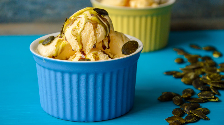 The ease of this dish makes it ideal for large gatherings, or for a more involved spread, you can offer a variety of oils for guests to mix and match the ice cream and oil flavors of their choosing to create the dessert of their dreams. Just be warned: Once pumpkin seed oil is stocked in your kitchen, you may find yourself using it on the regular to upgrade not only dessert but also lunch sandwiches and breakfast bagels.