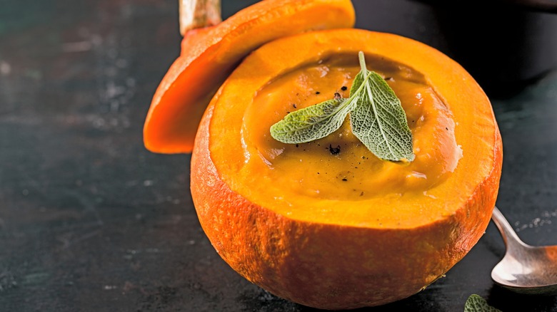 "Most of your decision-making depends on the flavors and texture you're looking to develop." She has three favorite pumpkin varieties for making creamy soups: sugar pumpkins, Cinderella pumpkins, and pumpkin's "cousin," butternut squash. Sugar pumpkins resemble mini jack-o-lanterns, which Jesse-Sierra said "are amazing either roasted and pureed into a velvety soup, or peeled and cubed into a stew." Using canned pumpkin over fresh for soup may be a time-saving shortcut, but sugar pumpkin's sweet and dense flesh will yield a more flavorful dish. Sugar pumpkins can also be used as individual bowls for a hearty vegan-stuffed pumpkin recipe.