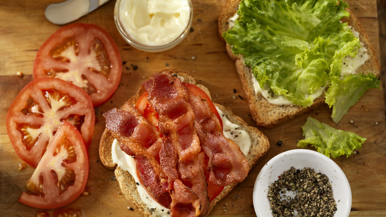 Turn your attention to the star of the show — bacon. The (quite literal) meat of the sandwich should serve as the perfect crunchy complement to the juicy tomato, crisp lettuce, and creamy mayonnaise, as well as match the bite of the toasted bread. In order to achieve the ideal texture, the thickness of your bacon matters. The general rule of thumb? The thinner the bacon, the better for a BLT sandwich. Although you may love a thick-cut piece of pork to go with your side of eggs in the morning (or in your copycat Egg McMuffin), the fact of the matter is that it won't cook up to crispy, crunchy perfection quite like a thinner strip will. Instead, you'll end up with a layer of meat that's more soft and chewy — preferable, perhaps, in other instances, but not if you're aiming to build a better BLT. Trust, you'll thank us before you take your second bite.