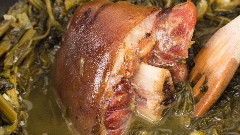 Modern recipes swap ham jowls and other remnants for whole smoked or cured, boned hams, filling the crevices left by the bones with the classic blend of leafy greens and aromatics. Still, a stuffed ham takes around six hours to roast. So, if you're not willing to put in the time, you can evoke the rich earthy umami flavors of greens and ham in simpler adaptations. For example, you could swap kale and cabbage for collard greens as ham is also a key ingredient in this equally classic Southern collard greens recipe. We also have a recipe for southern fried cabbage that sautes cabbage with butter, onions and bell peppers, using bacon instead of ham for that decadent savoriness. You can deconstruct the stuffed ham by serving a glazed or smoked ham with sauteed kale or these roasted cabbage wedges. For an upgrade on deconstructed stuffed ham, serve ham with Irish colcannon, a mashed potato recipe infused with cabbage and kale.