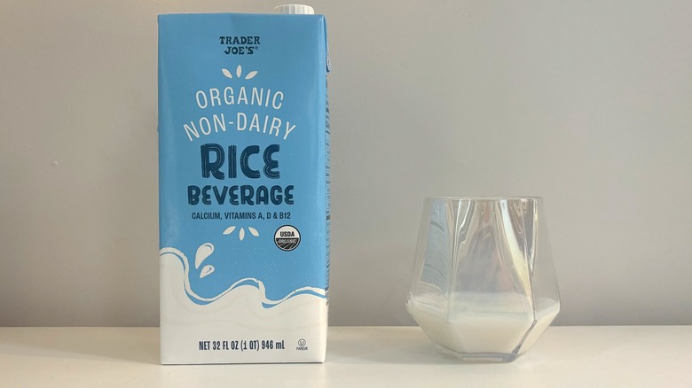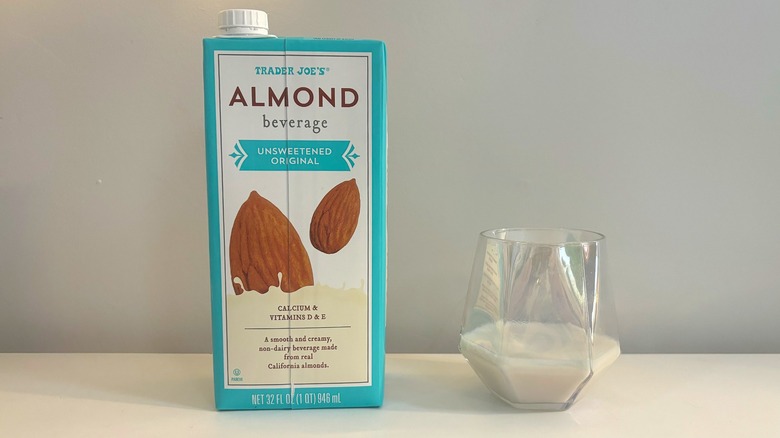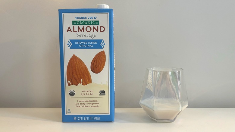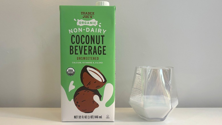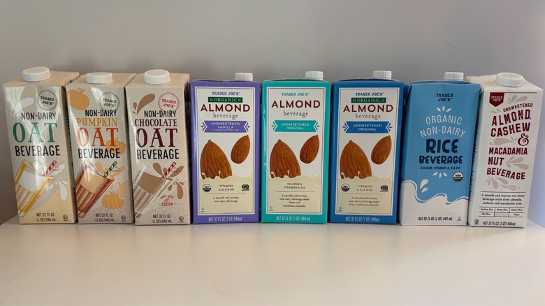 Fortunately for those of us who suffer from any type of lactose intolerance or dairy allergy, we live in a time when dairy-free alternatives of our favorite foods are plentiful. It's not uncommon nowadays to enter a grocery store and find a wealth of non-dairy products at your disposal. This rings especially true when it comes to a fan-favorite grocer: Trader Joe's. The chain takes its customers' food preferences seriously, and it's succeeded in formulating excellent alternatives to products that are usually rich in dairy, such as coffee creamer, yogurt, and cream cheese. Browsing its aisles will also bring you to an entire section of dairy-free milk beverages.