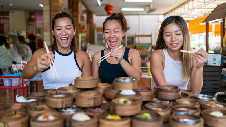 Like any meal best enjoyed family style, a healthy number of tablemates will elevate your time at any dim sum restaurant. Caroline Xaiyasiha explained, "Dim sum is a phrase that means 'touch the heart' and are bite-sized dishes that are meant to be shared." Not to mention, the more people in your party, the more dishes you can order and try without getting stuffed too early. It's even better if your group arrives hungry to throw themselves into the experience without being wary of over-ordering.