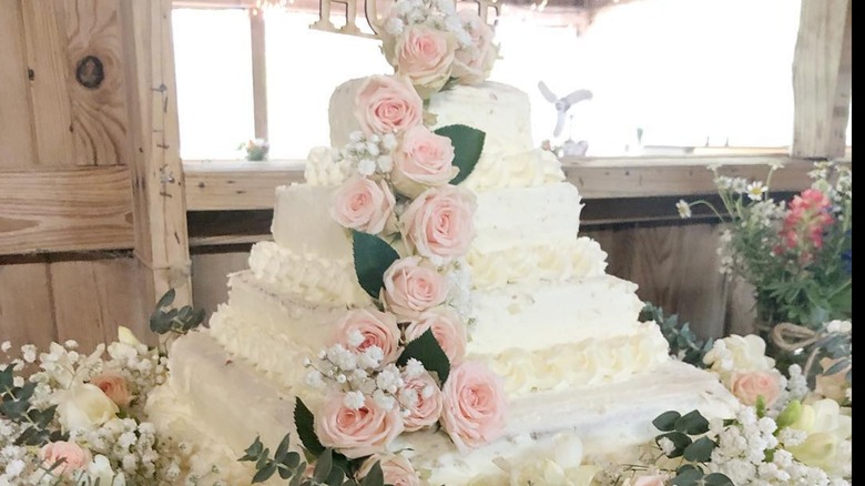 Decorations like white roses make an elegant option for turning a regular Costco cake into a wedding cake. Even if your location doesn't offer a specific wedding cake option, customers on social media reveal that they have used both the round and the sheet cake as options, with guests raving about the cake because it tastes so good. Some customers order a small, traditional tiered cake from outside the bakery to use for photos and then use Costco sheet cakes to feed their guests.