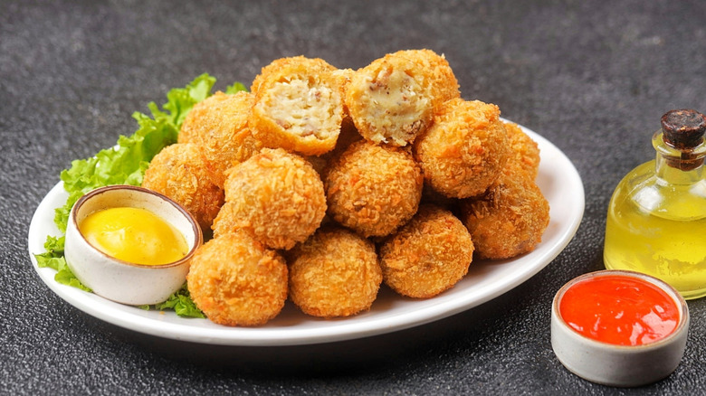 No visit to the Netherlands is complete without a sampling of bitterballen, the quintessential Dutch snack that was designed to be eaten alongside an alcoholic drink like gin or beer (aka bitters). Indeed, despite what their name may first lead you to believe, bitterballen are, in fact, not at all bitter, but rather a crispy and indulgent savory snack consisting of crunchy bite-sized balls that are filled with a rich and flavorful beef ragout. The sumptuously soft and tender consistency of the ragout — or more generally, a meat and gravy mix — is made by stewing beef with an array of herbs and spices. After the mix is thickened, cooled, and shaped into small balls, the bitterballen are breaded and deep-fried, granting them an inviting golden-brown exterior that gives way to a beautifully rich and moist interior.