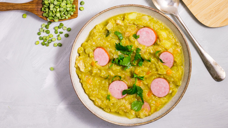 Snert — also referred to as erwtensoep (or "pea soup" in English — is a thick and warming soup made from split peas, pork sausage (typically the smoky and salty rookwurst), and other veggies like carrots, celery, and potatoes. Creamy, filling, and with a consistency that should allow a bowl of the stuff to support an upright, standing spoon, snert is the ultimate comfort food, offering itself as a hearty remedy to colder temperatures and biting Dutch winds. It is so beloved in its home country, in fact, that the city of Groningen hosts The Pea Soup World Cup competition annually. So, it's fair to say that the dish is not simply regarded as food, but somewhat of a national treasure.