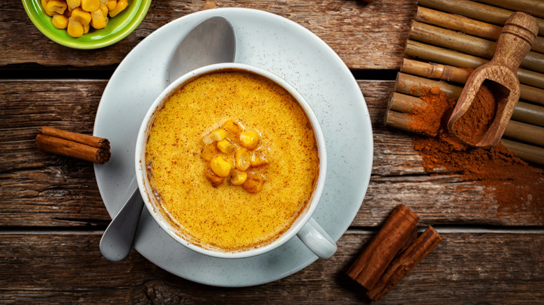 Because of the corn flour, the drink becomes thick. Some describe it as drinking hot corn sugar because of the intense sweetness from the pineapple juice. The drink itself is a warm purple, mimicking the color of beets, and is often a bit frothy after it's been mixed. And although adding flour to a beverage may seem highly unique, it's actually a practice used to thicken hot chocolate around the world.