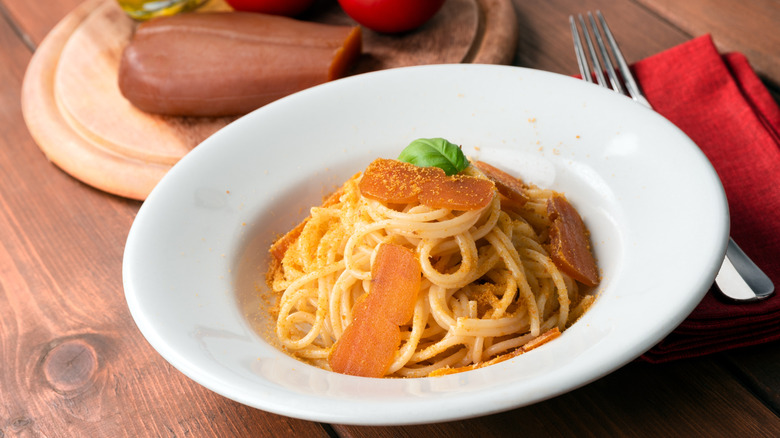 When hearing about Martha Stewart's favorite pasta, you may expect her to talk about lasagna, tagliatelle Bolognese, or spaghetti alla Scoglio. But her answer is actually a pasta shape you may be less familiar with and an ingredient that most of us won't have heard of. Bucatini with bottarga is a Sicilian dish that Stewart tried when she first visited Sardinia, and it features the unusual 'caviar' of tuna or mullet. Whereas true caviar comes from the sturgeon, this Mediterranean version is the roe of grey mullet or tuna, a prized ingredient in the southern Mediterranean.