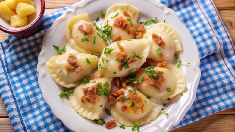 Common savory fillings include the classic potato — Stewart recommends using Yukon Gold — cheese, and cabbage. But Stewart's mother also made dessert pierogi using berries or stone fruits. Making your own homemade pierogi can be time-consuming, but like crafting your own pasta, it will be worth the effort. Thankfully, the little dumplings will let you know when they are cooked by rising up to the top of the boiling water in the same way that ravioli does, making it difficult to overcook them.
