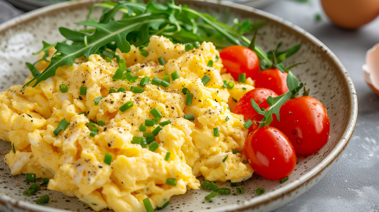 While readily available in stores, you can make your own clarified butter with little effort. Stewart recommends using Kerrygold as it works well, but you can use whatever butter you have. After adding the clarified butter and eggs to the pan, stir them gently with a spatula as they cook, before serving them with a sprinkling of fresh herbs as a satisfying breakfast or brunch.