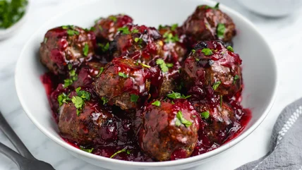The sauce offers similar flavors to the Thanksgiving classic any time of year in our cranberry meatballs recipe developed by Catherine Brookes. There are a few reasons why the tangy fruit sauce melds well with meatballs. For starters, most meatball recipes use rich proteins like beef, turkey, or lamb. The other ingredients from aromatics to breadcrumbs also provide savory notes. A contrast in flavors makes foods more appealing to the palette, which is when the sweet, tangy, and tart fruit comes into play. Not only do the flavors contrast, but balance each other out in every bite. It also gives a festive flare to the dish during celebrations for the holidays. No reason to waste those cranberries, right?