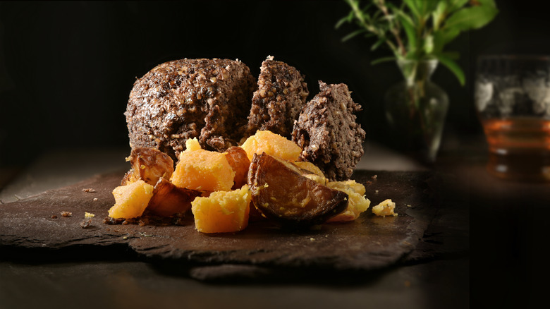 For something most people in the U.S. have never eaten, the mention of haggis can evoke strong reactions, but if you want to get a taste of something very similar, you only need to go as far as Pennsylvania. Haggis, that dish of sheep's stomach stuffed with a mixture of oats and chopped offal, is sometimes held up as a point of ridicule for the culinary prowess (or lack thereof) of the Scots, but the tradition of using up unwanted meat after butchering is something that crosses cultures. Pennsylvania already has a food like that which you might be more familiar with: the pork and cornmeal mixture known as scrapple. But Pennsylvania chefs' thrift with the pork doesn't stop there — they also created a haggis-adjacent dish with a pig's stomach.