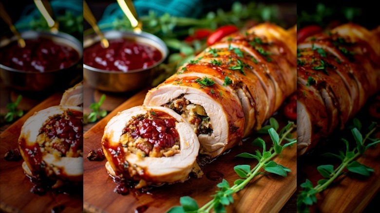 Whether you're stuffing a special bird for Thanksgiving or dressing it as the centerpiece of a winter solstice feast, there's nothing like a roast turkey. Even with all of the tips for cooking a perfect turkey, however, the one thing that you can't avoid is a lengthy cooking time. Depending on the size and state of your turkey, it can take anywhere from three to six hours to roast. For a more convenient and still unforgettable turkey dinner, change up your routine with a roulade. That is, a flattened piece of turkey breast wrapped in a spiral around the stuffing of your choosing and then baked. This process typically takes less than three hours at maximum and allows for a lot of creative stuffing choices, which you'll certainly have more time to prepare.