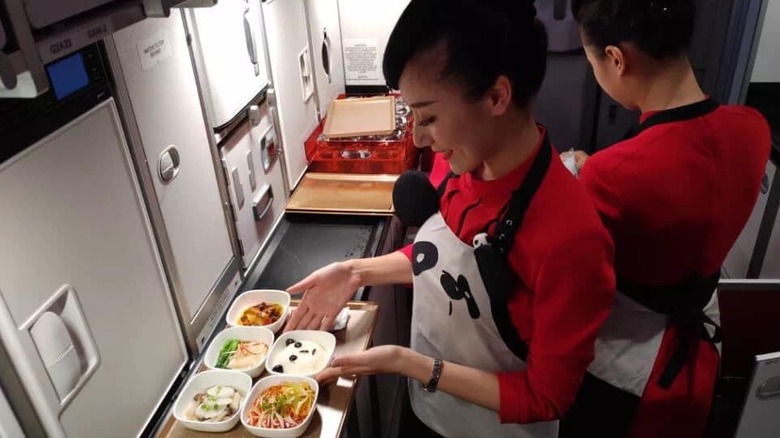 Affectionately named "Old Godmother," Lao Gan Ma was created by a Chinese widow trying to make ends meet by selling noodles. Tao Huabi took a chance and dedicated her business to her sauce, and today, she is still the face on the bottle. The sauce is lauded by top chefs including David Chang (who famously defended the brand when he received criticism over his attempt to trademark the term "chili crunch"), and all told, Lao Gan Ma produces nine types of chili-based condiments for the U.S. market. While we aren't exactly sure which condiment is circulating the airline's cabins, it's safe to say that Lao Gan Ma spicy chili crisp is likely one of them. The brand also makes bean paste and hot pot base paste.