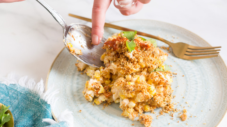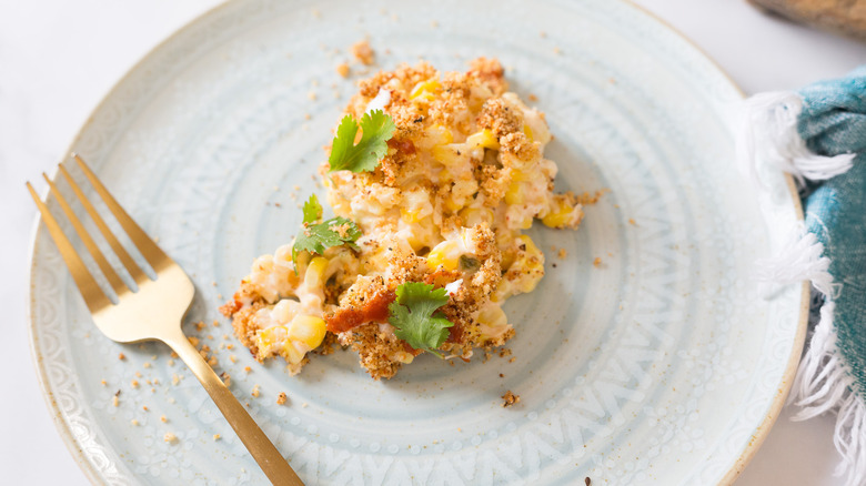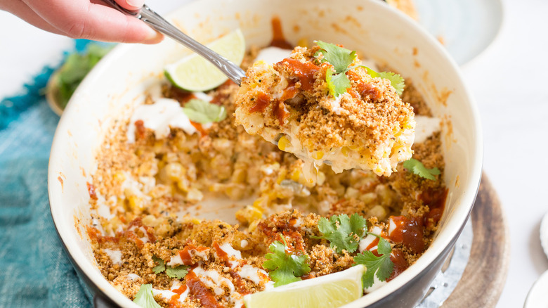 If you're looking for a fun twist on classic Mexican street corn, you've come to the right place. According to Ksenia Prints of At the Immigrant's Table, "This fusion dish is a perfect example of how culinary traditions can blend to create something new and exciting." Our recipe combines the beloved flavors of Mexican elote — grilled corn slathered with a creamy, tangy sauce and topped with cheese — with the convenience of a casserole, making it more like esquites. The dish gets its name from the popular bang bang sauce, a spicy, creamy condiment often used in Asian-fusion cuisine. This casserole brings together the best of both worlds: the smoky, sweet taste of street corn and the bold, spicy kick of bang bang sauce.