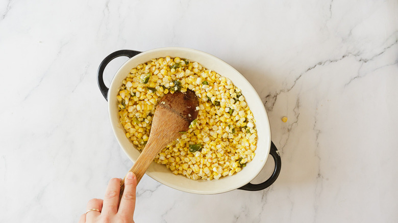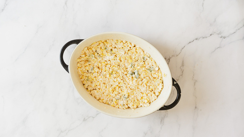 - In a 9x13 casserole dish, combine corn, jalapeños, crema mixture, and remaining salt.
