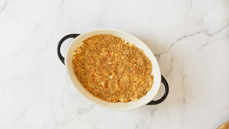 For the bang bang topping, you'll need canola oil, panko breadcrumbs, smoked paprika, and dried Mexican oregano for added texture and seasoning. Don't forget the salt and chipotle powder for an extra kick of heat and flavor. And for optional flavor, we recommend serving your casserole with lime wedges and fresh cilantro. With these ingredients on your counter, you're well on your way to making a bang bang twist on traditional street corn.