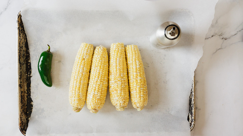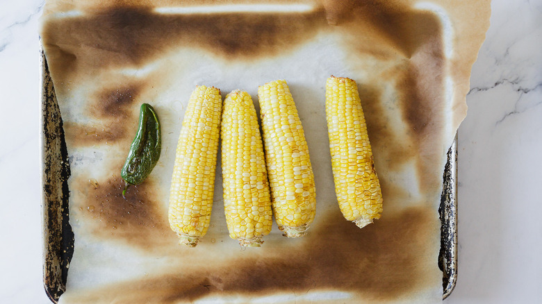 - Rub corn and jalapeño with 2 tablespoons oil. Place on the baking sheet.