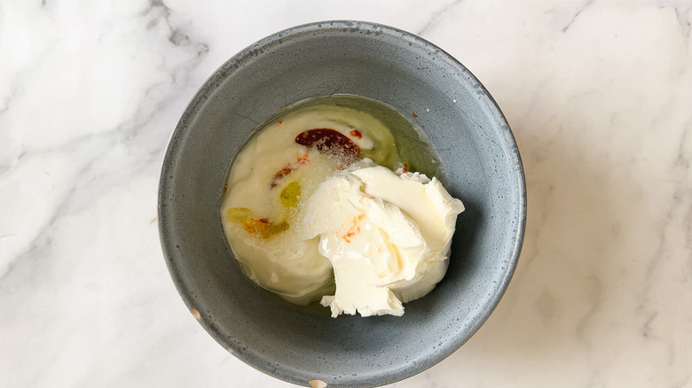 - Mix cream cheese, crema, lime juice, Sriracha, rice vinegar, 1 tablespoon oil, and ½ teaspoon salt in a bowl.