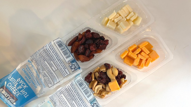 This may be an unpopular opinion, but I think these Kirkland cheese, fruit, and nut packs should have been the discontinued Kirkland fruit and nut snack. A large box contains 16 snack packs — eight have sharp cheddar, cashews, and cranberries, and the other eight have white cheddar, almonds, and cranberries. Both were ultimately fine, but they were pretty bland. I would only buy these if I needed a lunchbox snack for picky kids, as I don't see adults enjoying them very much.