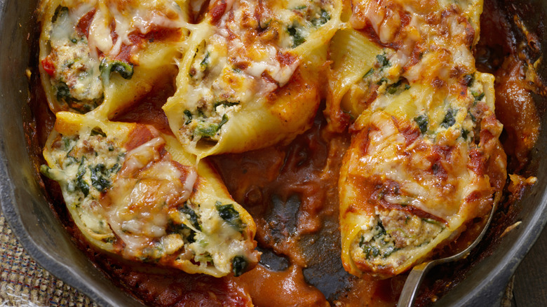 Make sure to cook more shells than you think you'll need so you can have enough intact should any of the pasta pieces break in the boiling process. Furthermore, feel free to get creative with your blend of cheeses, knowing these shells can hold quite a bit of filling. Don't be shy about spooning generous portions of any of your favorite béchamel-based sauces over the big shells in your baking dish before heaping on a final layer of red sauce and cheese that will melt and crisp up in the oven for a perfect topping.