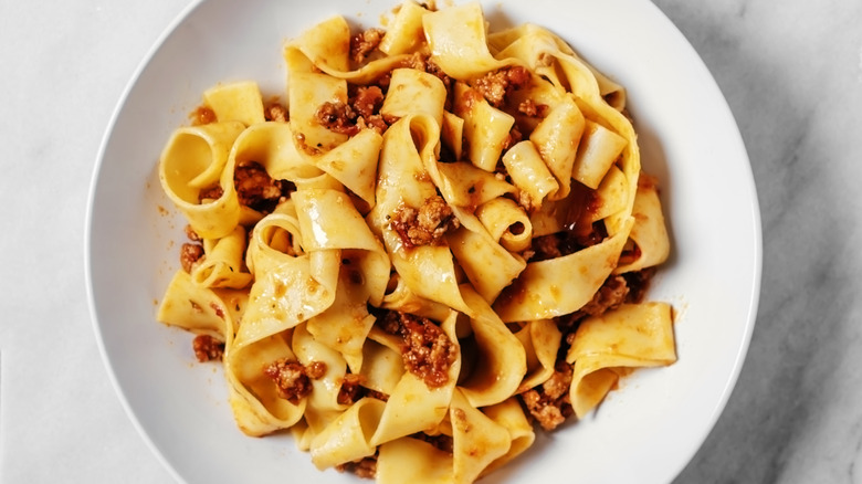 If you want to get close to a classic lasagna Bolognese recipe while subbing in pappardelle noodles, you can start by cutting the cooked strips of pasta into dish-sized pieces to create layers between your meat sauce and cheese. Make sure to use an ample amount of the pappardelle pasta to get full coverage. And definitely don't skimp on the cheese. Once it's put together, you'll be pleasantly surprised how easily this mimics the mouthfeel of a typical lasagna.