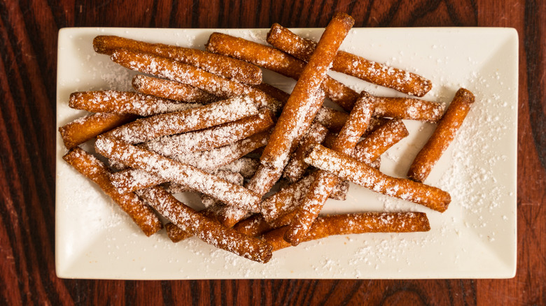 Making a funnel cake the traditional way requires a pretty involved setup. The dough is suspended above a vat of hot oil and slowly drizzled into the oil through a funnel in a circular motion to create those signature coils. Chances are, the average home cook has neither a massive vat of oil on standby nor the time and motivation to embark on that whole trip. Luckily, fries are here to expedite the process and bring extra craveable salty power while they're at it.