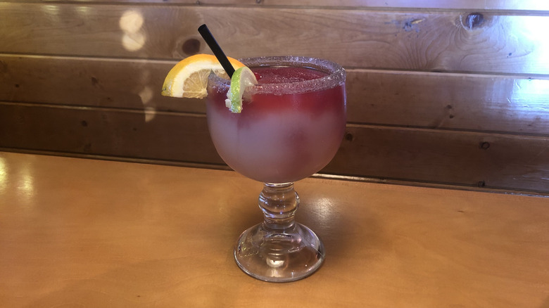 The old saying goes "wine before liquor," but what about if you drink the two simultaneously? Texas Roadhouse's sangria margarita allows you to take a walk on this boozy wild side. It fuses its frozen house margarita (ah, we meet again) with its classic red sangria. The combination of the two makes for a festive yet slightly menacing swirl of deep maroon and pale green that greets you as the great goblet is brought round to your table. Meanwhile, three different garnishes — including an orange slice, lime wedge, and maraschino cherry — hint at the beverage's diversity of ingredients.