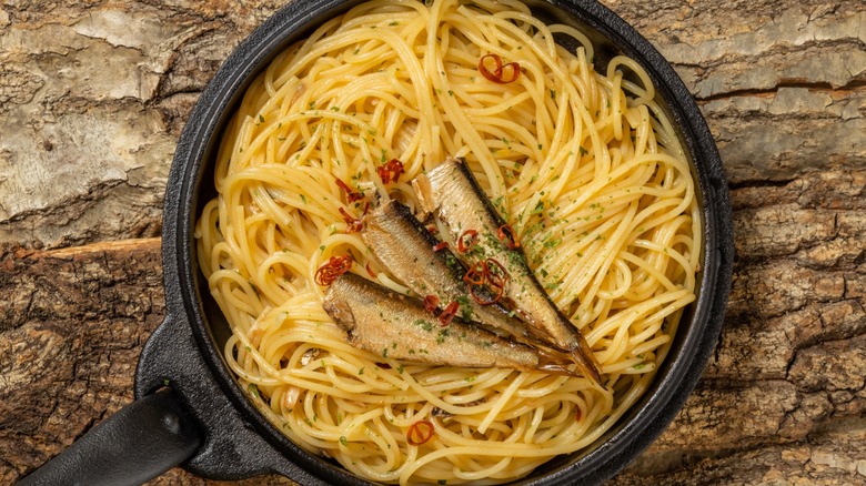 But no matter where you choose to use your anchovies, don't miss out on what may famously be one of the easiest and most crave-worthy dishes on the planet, courtesy of celebrity chef, travel host, and author, Anthony Bourdain. The recipe (Spaghetti with Garlic, Anchovies, and Parsley), was featured in his 2016 "Appetites: A Cookbook" and showcases its eponymous ingredients (along with parmesan and red pepper flakes) in a dish that is so rich, delicious, and habit-forming, you'll be making it once a week (at least!)