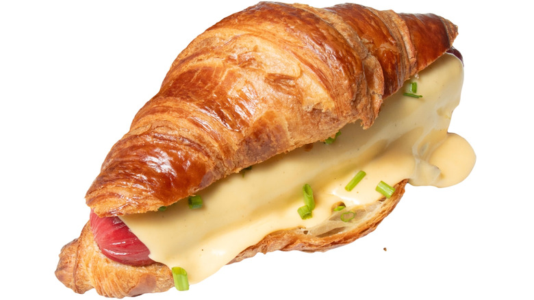 Reddit user asianzest recently tried this bakery hack and compared the taste to a "flakey and buttery" pig in a blanket. They only used one condiment, yellow mustard, but you could easily get wildly creative with this croissant dog and add melted cheese — Swiss, perhaps — chopped onions, pickle relish, or any other preferred condiments. You can also go all-out and create an open-faced croissant dog, giving you room to add all kinds of goodies to your sandwich.
