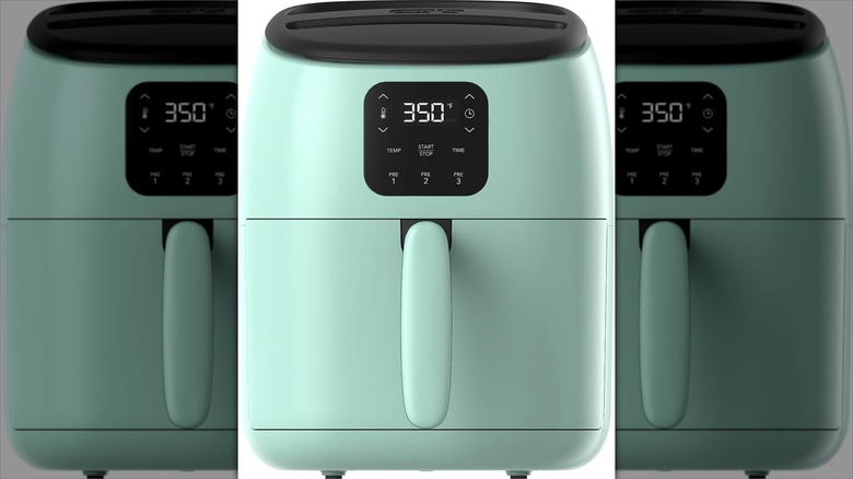 Having a 5-quart capacity allows you to cook for more people. In addition to an air fry option, it has options for roasting, toasting, grilling, dehydrating, or baking food. You can also opt to reheat food or just keep it warm. Additionally, you can raise and lower the temperature between 180 and 400 degrees Fahrenheit or decrease or increase time by up to an hour in 10-minute increments. Customers like how easy it is to use and rave about the texture of their food inside and out. While the pan is made of non-stick PFOA-free ceramic, it is unfortunately not dishwasher safe. However, users say it's still easy to clean. You can get one in black, mint, or red with silver trim, or opt for black with copper trim. A warranty is available from the manufacturer for the asking.