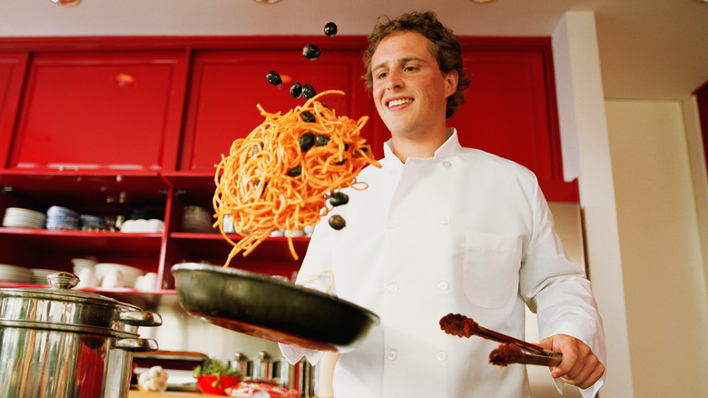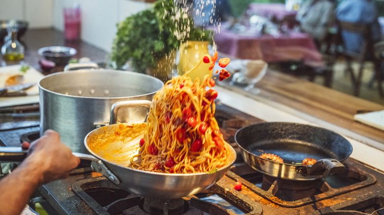 If you're feeling ambitious, try tossing the pasta entirely in the air as you would see chefs do in a professional kitchen. While it definitely takes some practice, it's worth the effort. The technique aerates the sauce, giving it a silky, light consistency that's hard to replicate otherwise.