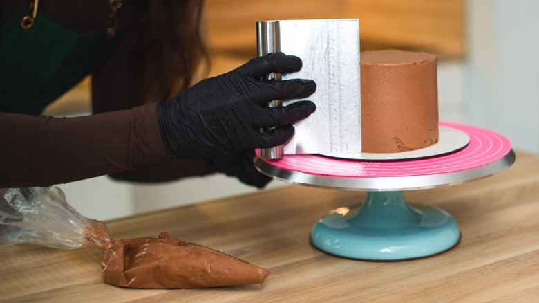 The trick is to hold the scraper steady while turning your cake on a turntable. The combination of a steady hand and smooth rotation removes excess frosting and leaves you with a polished finish. For ultra-sharp edges, crumb coat and chill your cake before applying the final layer of frosting. Use the bench scraper while the frosting is firm but pliable, and don't forget to wipe it clean between passes for the best results.