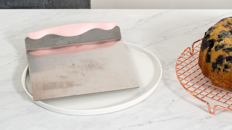 A valuable companion for your cake turntable, and the absolute best tool for getting that flawlessly smooth frosting finish on your cakes, a bench scraper is a must have item for any cake decorator. And you don't have to be a professional to use it. A bench scraper is a flat, sturdy blade with a handle, that's relatively long and wide. You can use it to smooth buttercream, ganache, or whipped frosting along the sides of your cake, creating those all-important clean, smudge-free edges.