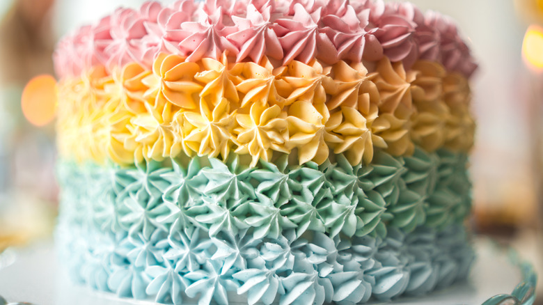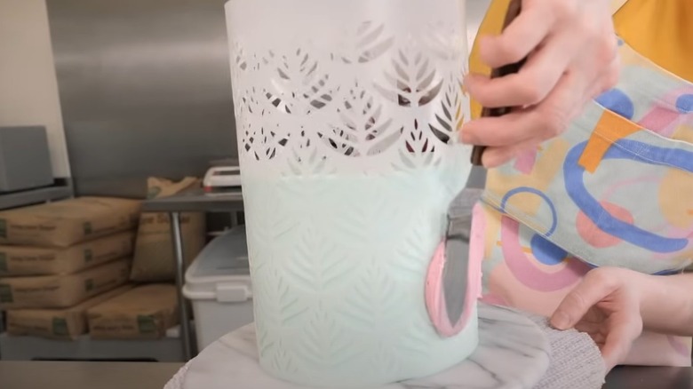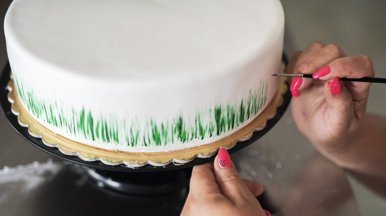 This technique involves first placing the stencil against your frosted or fondant-covered cake. If you're using frosting, make sure it has a fairly firm consistency and leave it to set fully beforehand. Once your stencil is in place, apply edible paint or edible glitter over the design. Colored buttercream can work wonderfully, too. When you carefully lift the stencil away, the pattern is left behind, creating a professional look with very little effort. Stencils are also work incredibly well for airbrushing (more on that in a moment!), where it's possible to create gorgeous ombré effects by blending different colors through the stencil. You can also use stencils to dust powdered sugar or cocoa powder shapes on top of a cake, so they're certainly a versatile tool.