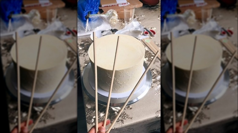 After frosting your bottom tier, measure the height of the cake and cut the dowels to match. You can do this by inserting a longer dowel all the way to the bottom of the cake, and marking where it meets the top, before removing it and cutting it down. You can then use this as a guide for cutting your remaining dowels. Push the dowels in the cake (only in the area that the next tier will cover), ensuring even distribution across all four quadrants. Then, you're ready to stack the next layer on top, and repeat the process again for any remaining tiers. For larger cakes, you can also insert a central dowel at the end that runs through all of the tiers for even more stability.
