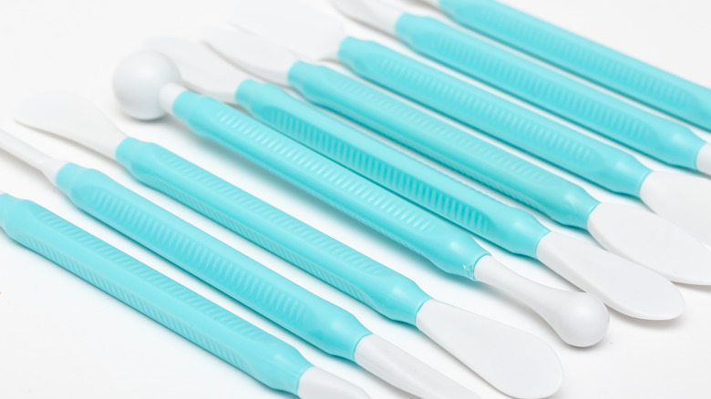 A standard set of fondant modeling tools might include differently-sized ball tools — sticks with a ball on one or both ends, and quilting tools — sticks with a serrated rotating wheel. The former are perfect for shaping leaves and petals, or defining facial features, whilst the latter are great for creating unique patterns textures like dots, dashes, or a fabric-like look. Knife and needle tools can also aid with slicing or positioning smaller pieces of fondant, or releasing any air trapped in the icing.