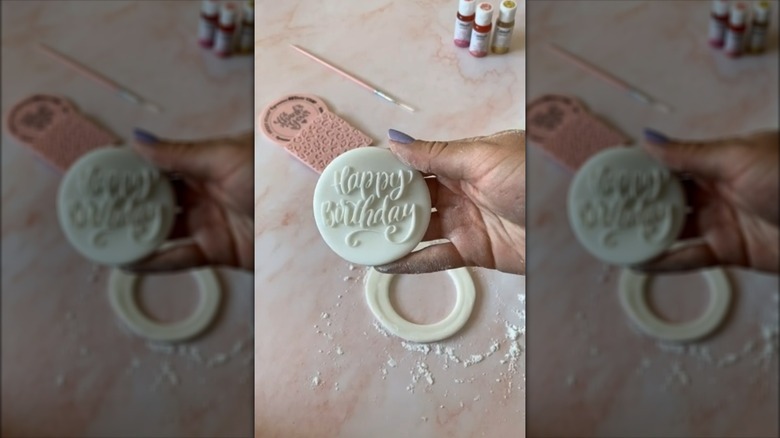 These stamps work best on fondant icing. Just roll this out and press the stamp firmly into the surface of the fondant. Lift the stamp away, and you'll reveal the design. Rather than transferring color to the surface like a traditional crafting stamp, the baking stamp will create an indentation in the fondant to either emboss or deboss your specific design. You can then add the decorated fondant pieces to a larger cake, cupcake, or even a cookie. Some stamps can also be applied directly onto a fondant-coated cake. These tend to be ones that produce a debossed effect (the message or design is depressed into the icing, rather than raised above it). To make this effect look even more impressive, try brushing edible paints over the stamped design.