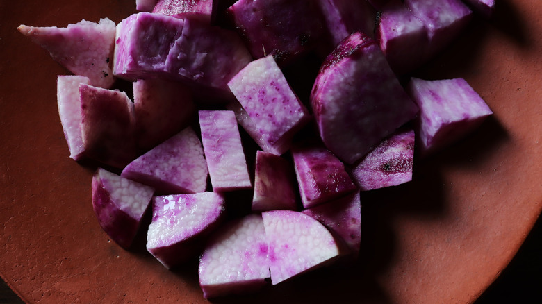 There has been a craze for ube in the past few years, and if you've had it for yourself, it may be easy to see why. Ube is made from a type of purple yam — which means it can impart a beautiful, dark lavender hue to almost anything that you bake with ube. Fresh ube, in general, is hard to come by, so it's more likely that you'll be using some variation of it — like ube extract, jam, or a powdered form. Moreover, many folks bake with ube for just the color, but when used correctly, it can impart a slightly vanilla undertone to bakes, which makes it an excellent fit for cookies.