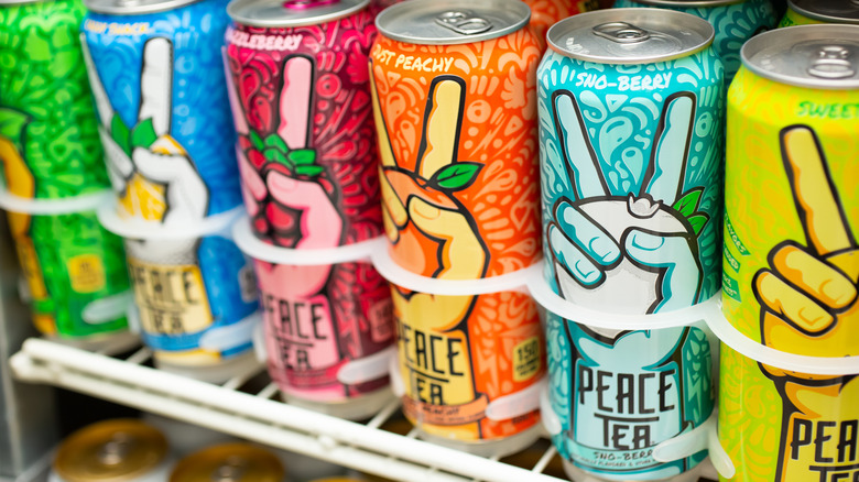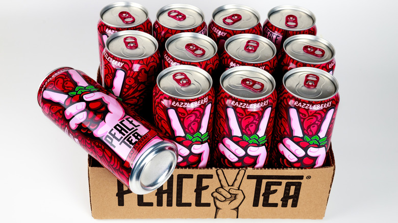 You might've seen one of these cans in a vending machine before — brightly colored, with an in-your-face design of a hand flashing a peace sign while clutching a fruit. If you're into iced tea, odds are good that you'll instantly recognize it as Peace Tea. This line of caffeinated iced tea from Coca-Cola has been in the wild for some time, and it's a fairly popular choice as a convenient and cheap pick-me-up. To see if it lives up to the hype, we've decided to pick up five cans of Peace Teas — one for each flavor — and carted them off to our reviewer for a taste test and ranking. While most flavors were impressive, the Sno-Berry white tea turned out to be a dud.