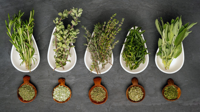 At the end of a busy or tiring day, when cooking everything from scratch feels like a chore, a frozen dinner can be quite the lifesaver. Most times, this also means you're sacrificing the flavors for convenience and a short time spent in the kitchen. Well, don't resign to whatever default taste those frozen packages offer just yet. There are plenty of ways to improve frozen dinners, from adding more protein to drizzling in a splash of your favorite sauce. When you just want to keep it as simple as possible, a sprinkle of herbs will do the job exceptionally.
