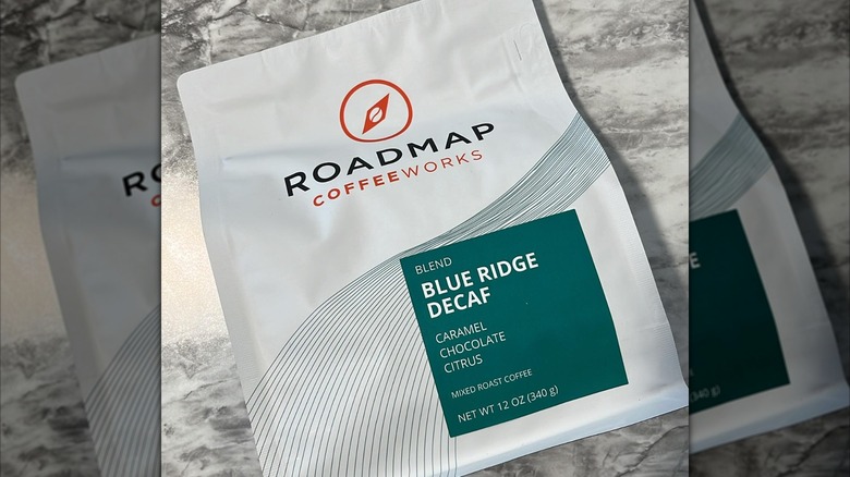 Decaf coffees can be a hit or miss — but mostly, they're a miss. While there are several different ways coffee is decaffeinated, ultimately the flavor is compromised with any type of caffeine removal. If you've ever had to go decaf, you know how hard it is to find something that tastes like the real thing. And yet, there do exist some java gems that nail the right flavor. Tasting Table embarked on a quest of testing 13 decaf whole bean coffees and found the one that can rival its caffeinated counterparts: Blue Ridge Decaf by Roadmap CoffeeWorks.
