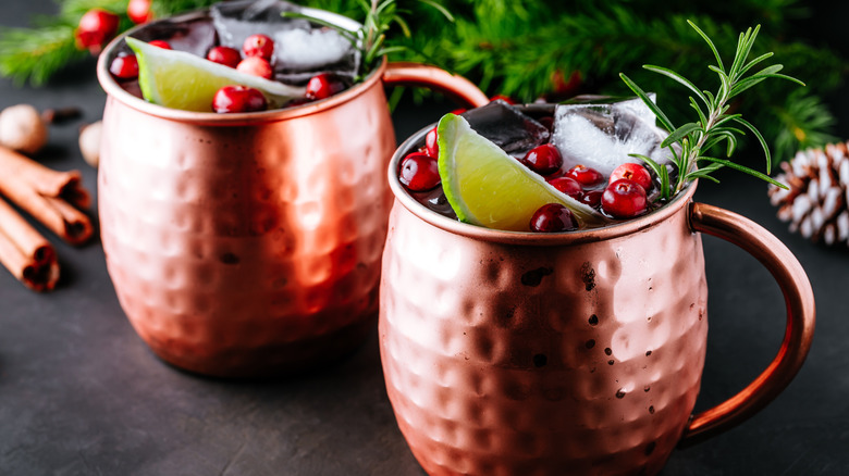 If you go with a cranberry-tinged mule, you can keep the party going with a classy and colorful garnish. Horn recommends garnishing with a few frozen cranberries, and she likes serving this option in a highball glass instead of a copper mug. This will allow your Christmas-hued green and red garnishes from the cranberries and lime or mint to shine, since it won't be dimmed by the traditional-but-dark copper mug. Alternatively, you could make infused ice cubes with cranberries, and then decorate the rim with a lime wedge.