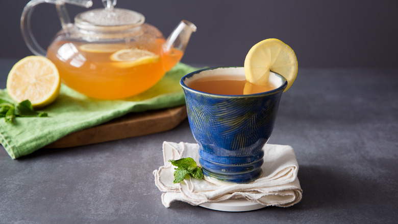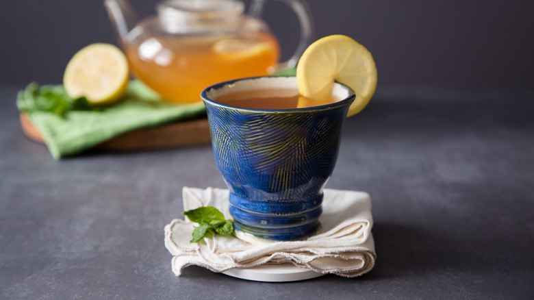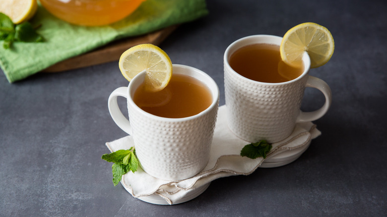 Recreate the Starbucks Medicine Ball, a mixture of citrus-mint and peach teas plus warm lemonade and honey, for a warm and comforting winter soother.