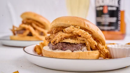 This juicy, flavorful bison burger emphasizes the tender meat by pairing it with bold toppings: crunchy onion straws and sweet and spicy Cajun bourbon mayo.
