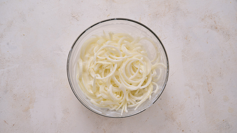 - Combine the onions and buttermilk in a large bowl, mixing well so that all onions are coated. Soak for 30 minutes, stirring often.