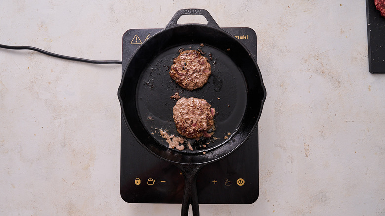 Working in batches, cook the bison burgers until deeply browned, about 4 minutes per side.