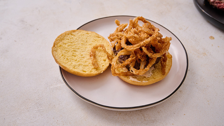 - To build the burgers, slather bourbon mayo on a bottom bun. Add the bison patty, then top with onion straws. Add top bun to serve.