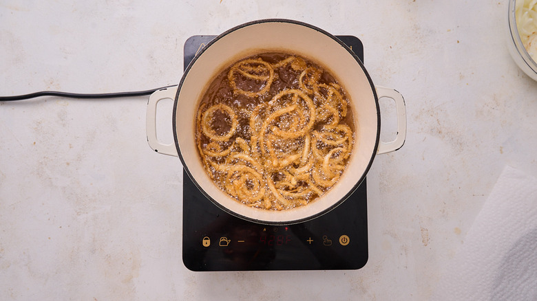 Frying onions is fairly straightforward, but there can be some surprises. Because of its acidity, buttermilk is useful for tenderizing meat. It also works this way for onions — buttermilk helps ensure a tender onion under the crispy coating, softening their flavor and making them sweeter as well. Besides that, it also helps provide a wet base for the flour to stick to. However, you might notice that it can make the onions gummy and gooey. To avoid this, work in small, fist-sized batches, and shake the buttermilk from the onions until they're just tacky enough to dredge. Then, toss in the flour gently and immediately add to the oil.