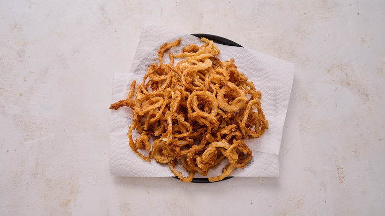Remove from the oil and drain on paper towels. Repeat with the remaining onions, working in batches.